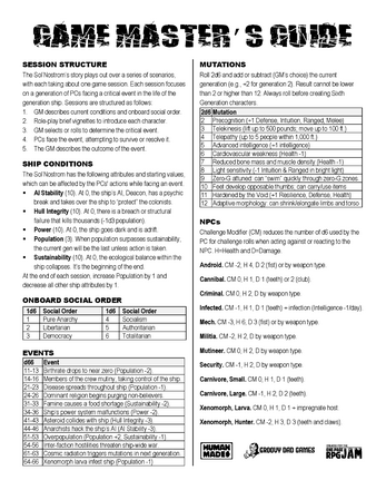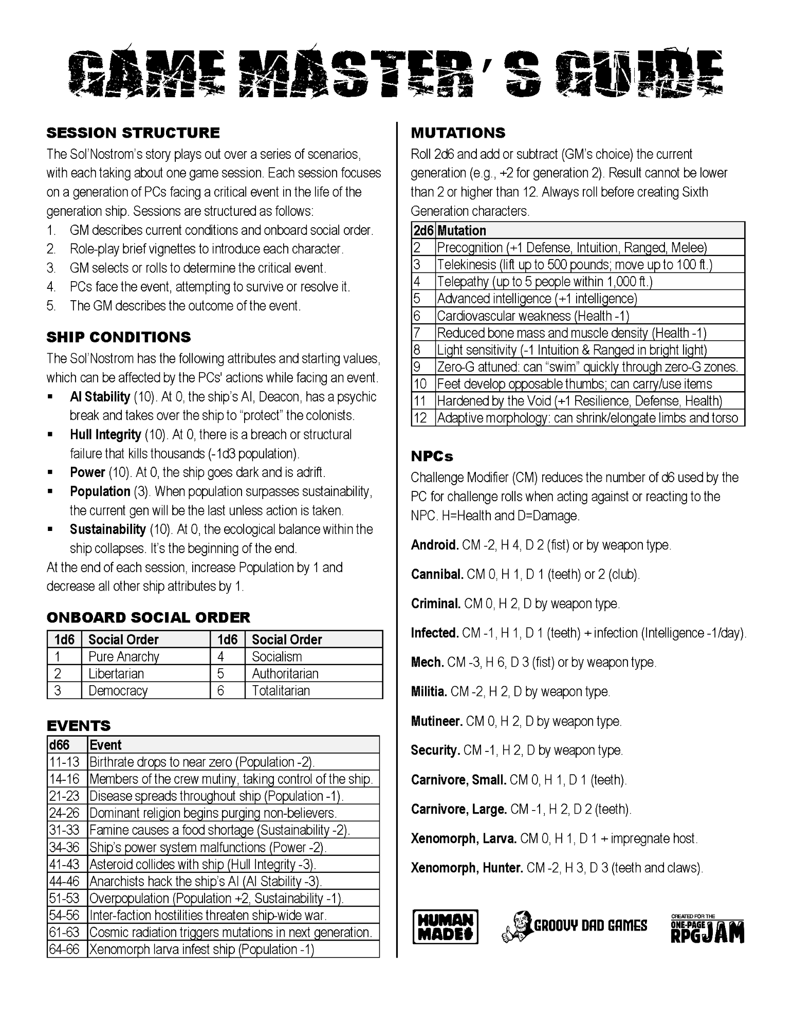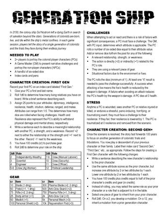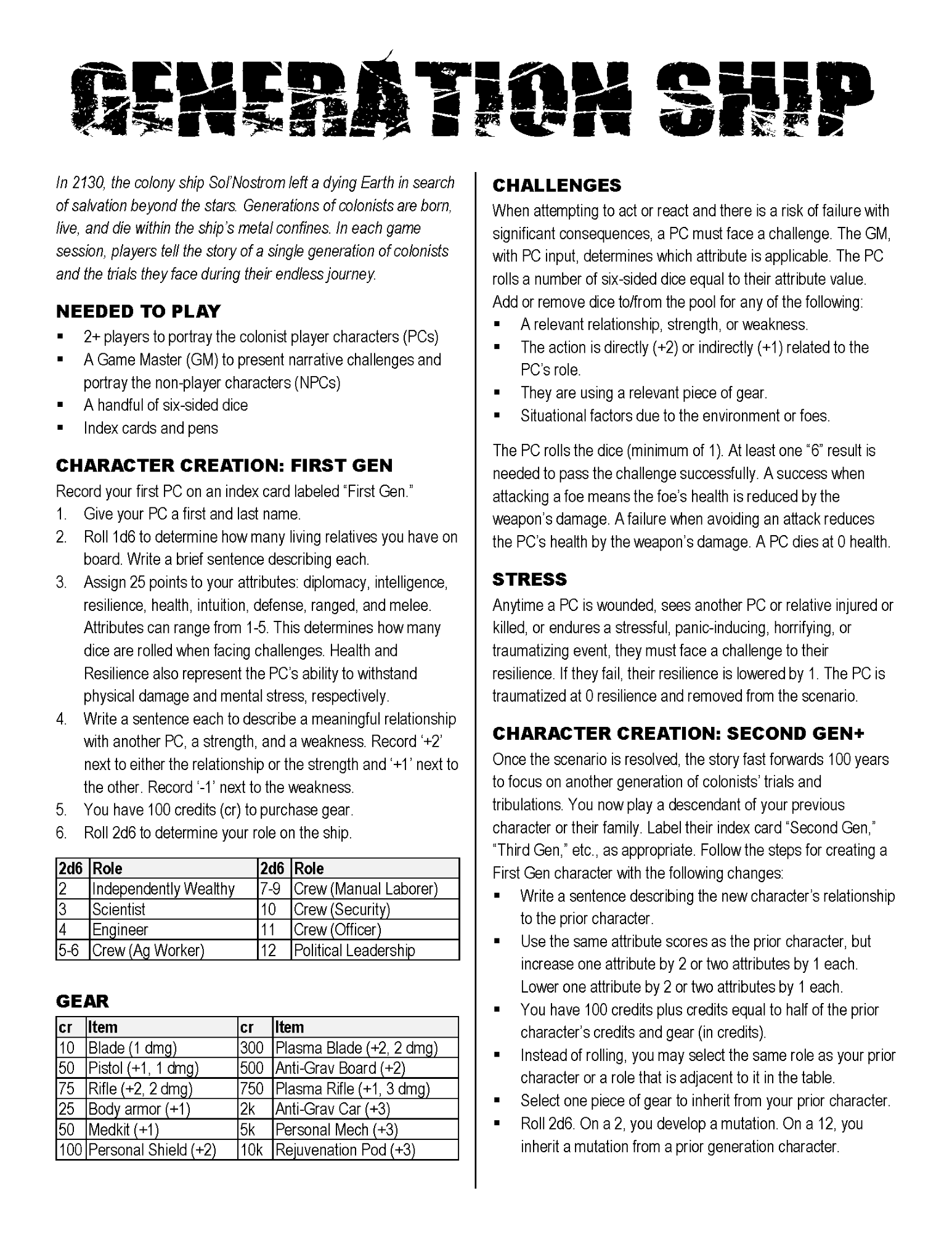 In 2130, the colony ship Sol’Nostrom left a dying Earth in search of salvation beyond the stars. Generations of colonists are born, live, and die within the ship’s metal confines. During each game session, players tell the story of a single generation of colonists and the trials they face during their endless journey.